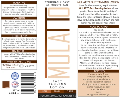 Mulatto Fast Tanning Lotion is a satirical commentary artwork on the problematic industry of sunless tanning products as a contemporary form of blackface and cultural appropriation.